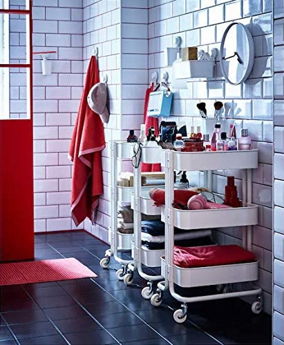 This photo shows three of the Ikea RÅSKOG Utility Carts decluttering a bathroom. I love that you can roll them out, mop the floor, then roll them back in. Roll the makeup over to the mirror…